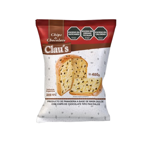 Pan dulce Clau´s con chips de chocolate. Cada caja contiene 8 unidades x 400grs.